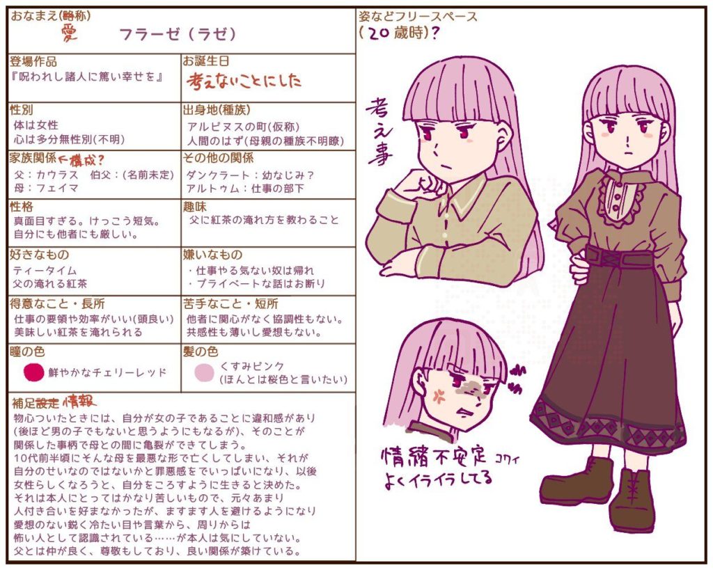 フラーゼのイラストまとめ いらすと情報 2022.01.022025.11.19 『僕だけの世界』より 『僕だけの世界』より 『僕だけの世界』より 『僕だけの世界』より ミニ原画「ふむふむ」 フラーゼと両親『二度と戻らない日』 2022年「うちの子大賞」 「後悔」 フェイマ(母) 「ずっと言えなかったこと」加筆 カウラス(父) ダンクラート(幼馴染) 2023年「うちの子大賞」 ダンクラート(幼馴染) スズク(養子) こんなのもあったよ。一部情報が違う・これからも変わるかもしれないけど。