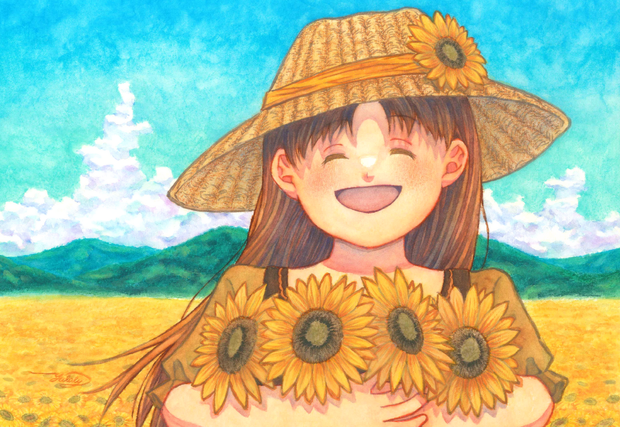 『ひまわりみたいに笑う君』 いらすと情報 2022.01.042023.07.22 パテルナ パラリンアート世界大会2021に応募した作品です、テーマは「笑顔」。 タイトルはユディくん目線です。 ウォーターフォード水彩紙(ナチュラル、中目、F4サイズ)、水彩色鉛筆 など