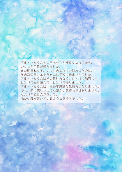 ご購入いただいた読者様から、どうしてエテちゃんがアルトゥムと関わろうと思ったのか分からなかったとご指摘いただきましたが、確かにこの内容では分からないと思います……まあ、アルトゥムが一人だったから近づきやすかったとか、ただ単に善意だったとか、そういった内容しか読み取れないかもしれませんね……実際はちょっと違う理由だったんですけど。