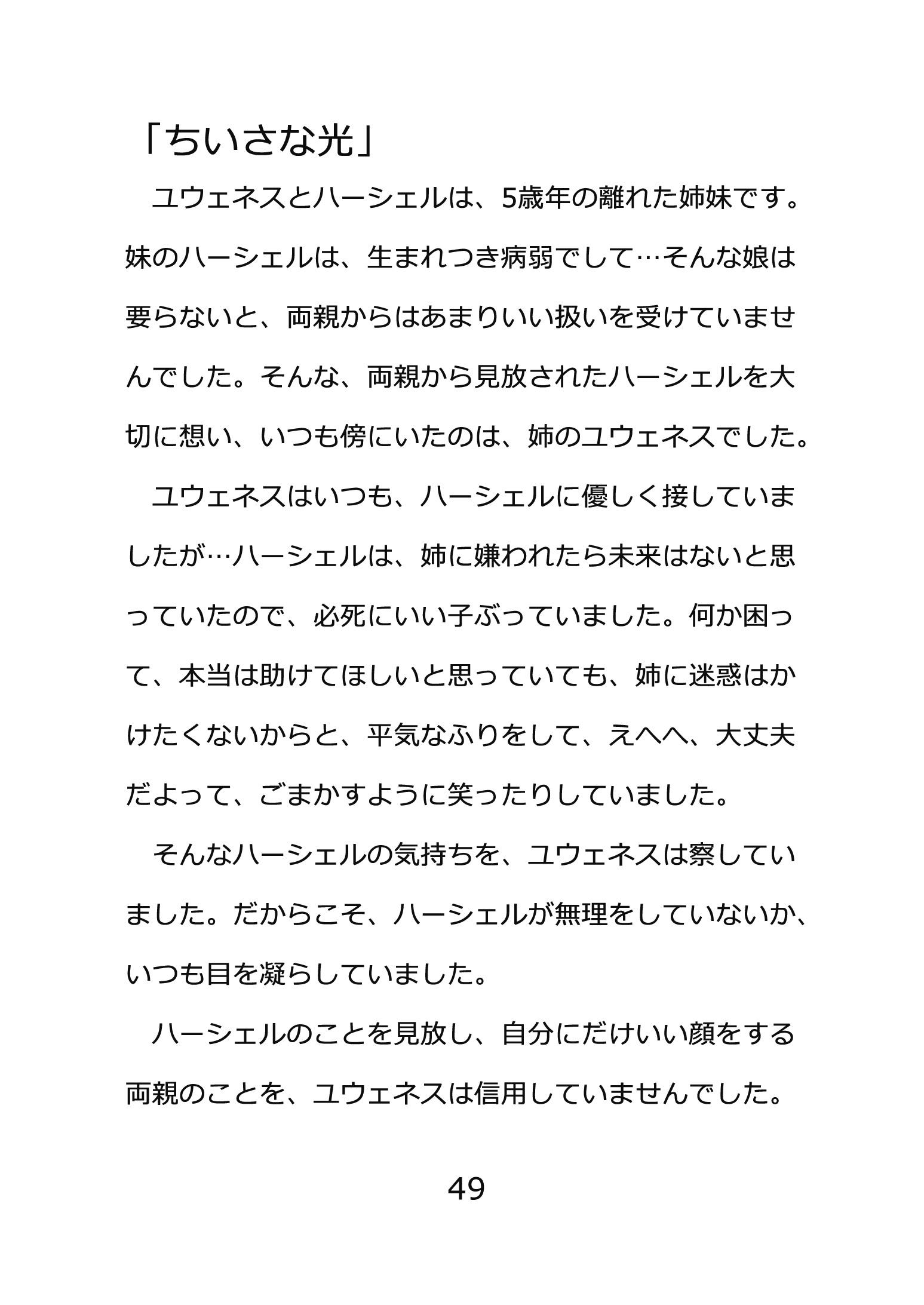 『ちいさな光』〜短編小説集『いっしょにいようね』より〜 うちの子情報 2022.10.28 はい、ひとまず物語をそのまま載せますね。 こちらの主人公はユウェネス、サブは妹のハーシェルです。 ここからは、あとがきという名の解説です。 ……以上、です。 こちらと合わせて、 『消えた光』 ハーシェルが生きてた頃のお話 も、お読みいただけますと、より理解が深まるかと思います。