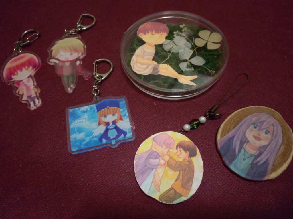 恐らく、手前側のストラップか、缶バッジor木のバッジになるかと思うのですが、私の創作意欲次第では別のものが入る可能性もあります。なお、印刷になるか手描きになるかも不明ですが、量産を企んでいるので印刷になる可能性が高いです。