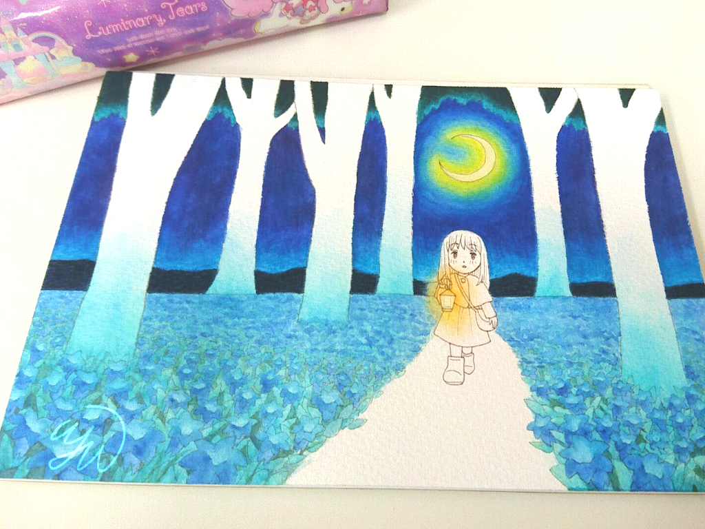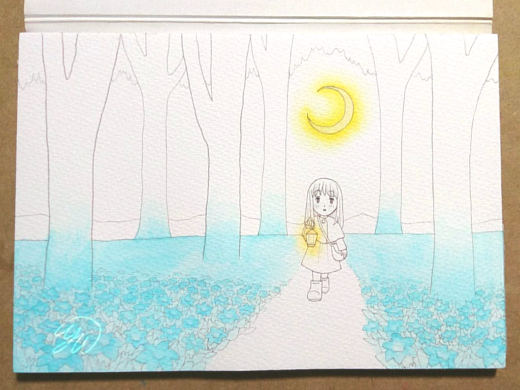 ウェット技法で光になる部分を先に塗ったようです。月とランプ、そして花が発光しているイメージです。