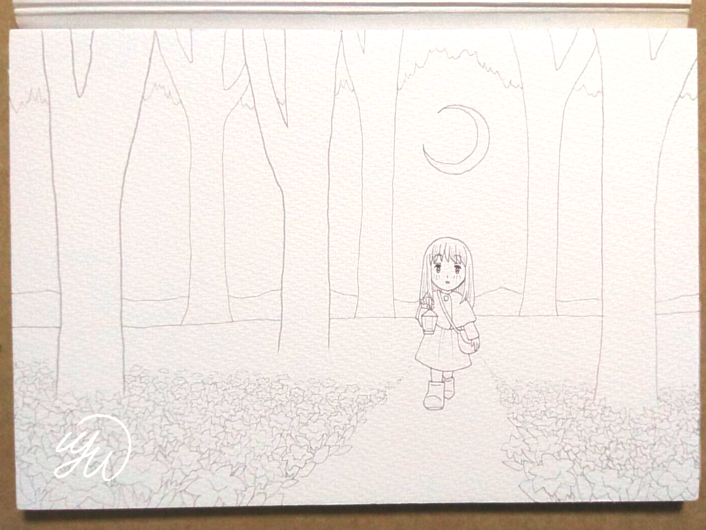 線画ですね。これもブロックタイプの水彩紙のようですので、トレースができないため直接下描き・線画を描いたと思います。ラフの画像はどっかいきました()