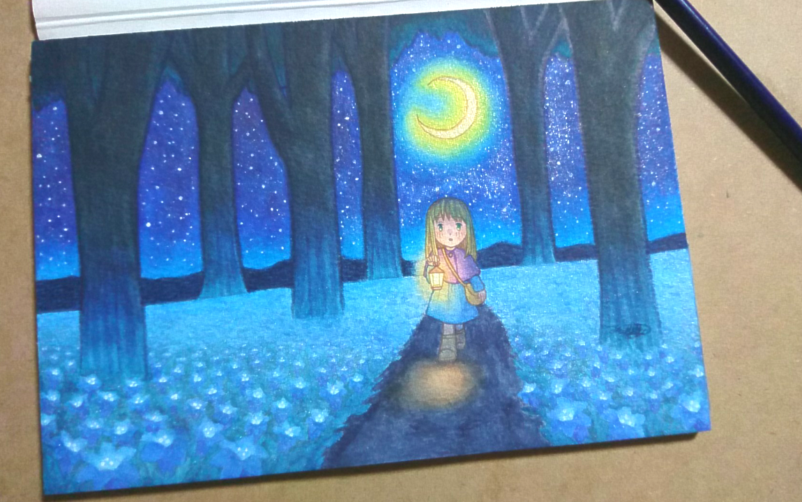 ウェット技法で光になる部分を先に塗ったようです。月とランプ、そして花が発光しているイメージです。