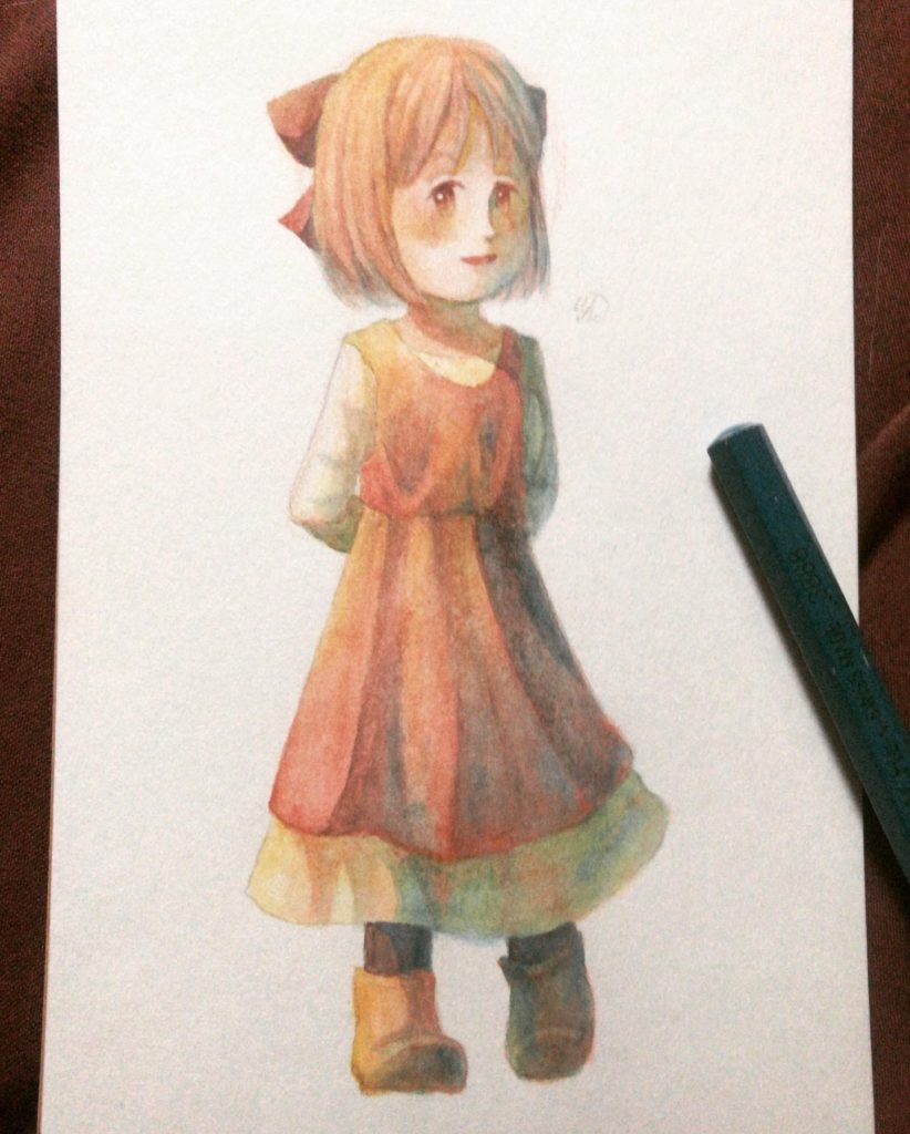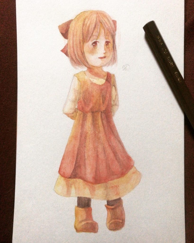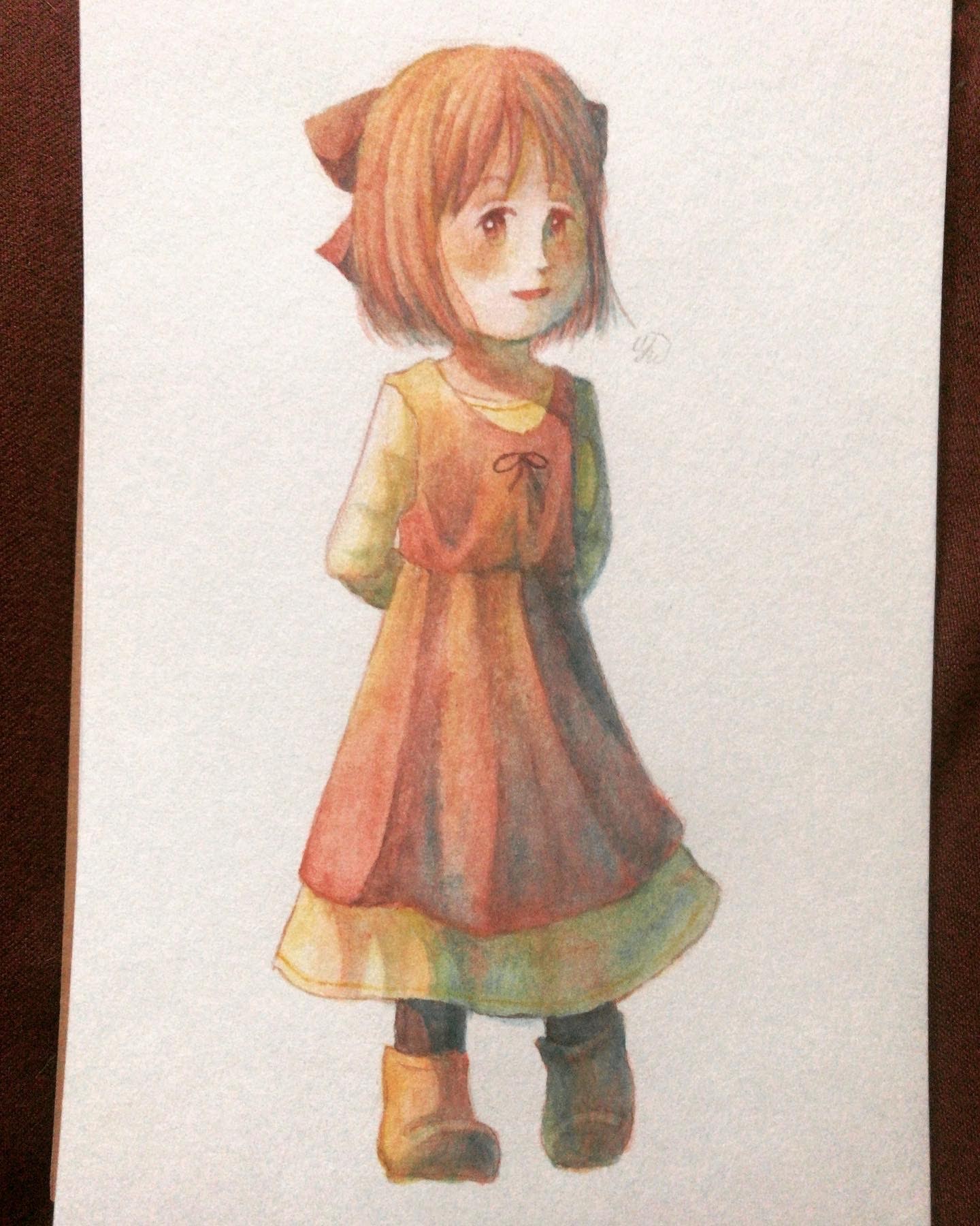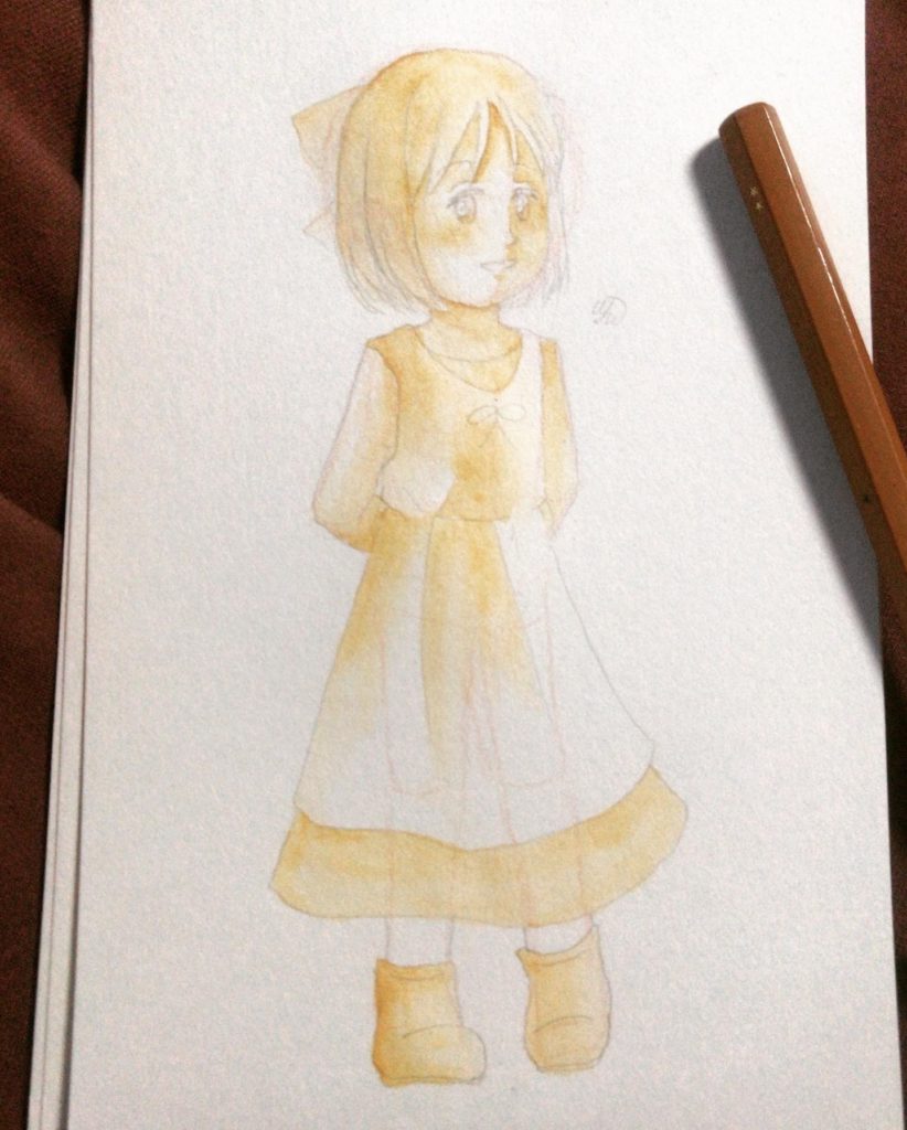 水彩色鉛筆の「ウォッシュ技法(水彩)」黄土色(?)で、光の当たる部分や、混色する箇所などに色を塗りました。