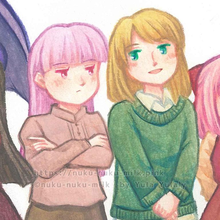 腕を組んでいるピンク色の髪の子と、それに話しかけている金髪っぽい子だよ。