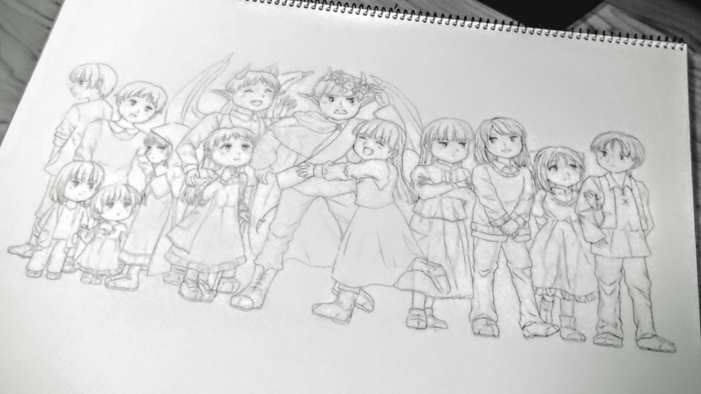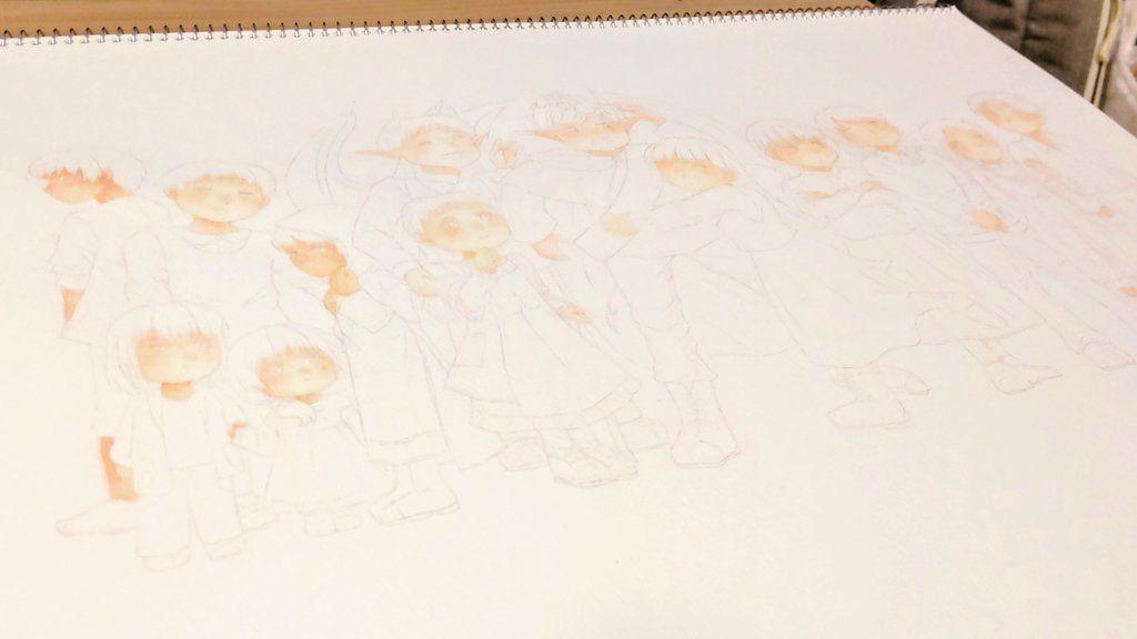 赤シャーペンで下描きして(写真はモノクロにしてあるけど、薄く写ってるよ、トロワさんの足とか分かりやすいかも)、(黒)シャーペンで線描いたって感じ。
